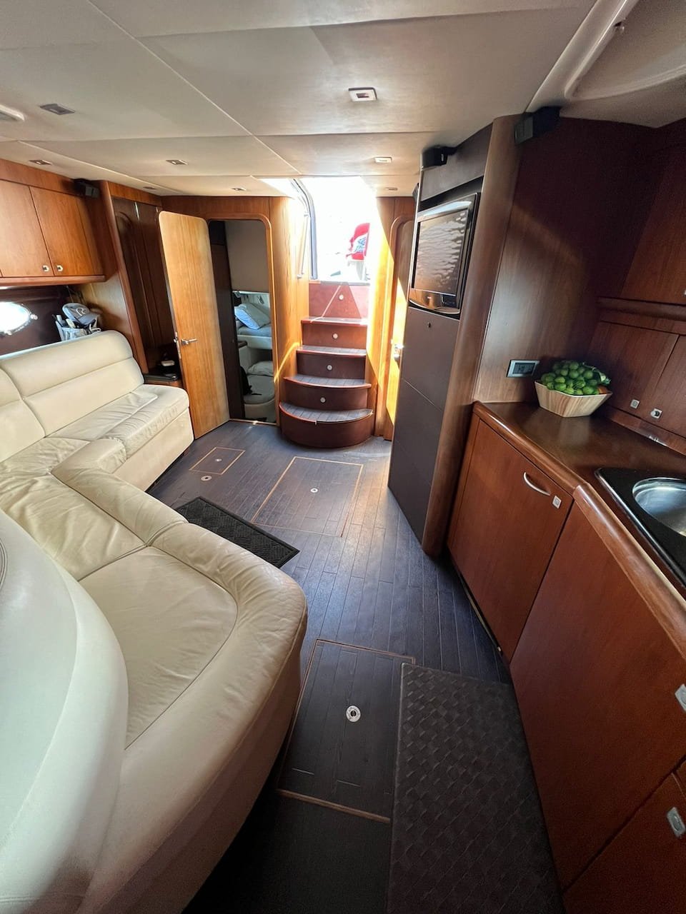 loungers at the bow, seating at the stern, a large living